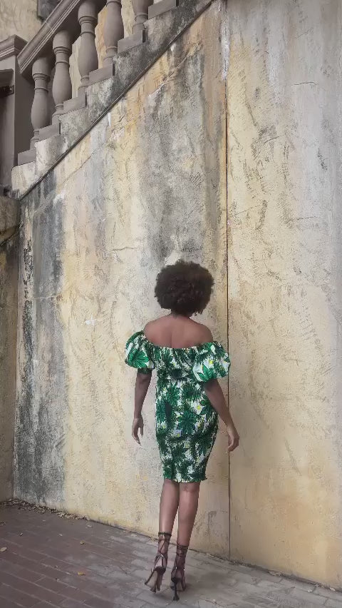 The Ankara print elastic stretch dress is spot on with its bright mix of colors! The smoked bodice of this dress is the best part.. It gives this dress a lovely form hugging silhouette. It's so feminine. The smocking is nice because it makes the dress stretchy and comfortable. This dress features African print fabric smocked to perfection, puff exaggerated sleeve detail with a smocked cuff . The sleeves can come on or off the shoulder.